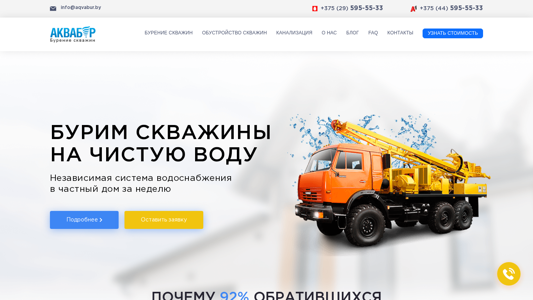 The website is about water well drilling services in Grodno and Grodnen Oblast. It offers installation of water and heating systems, water purification, and well arrangement. The website emphasizes low cost, guarantee, and free consultation. The phone numbers for contact are provided: +375 29 595-55-33 and +375 44 595-55-33. The website includes a main page, a page for drilling services, a page for well arrangement, a page for installation services, a page about the company, a blog, and an FAQ section. The website offers drilling services for private homes, the process takes a week, and the company has been operating since 2009. The company works under contract, without pre-payments or hidden charges, and uses equipment and materials directly from manufacturers. The company