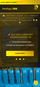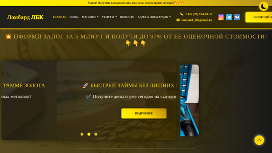 | AI-анализ | The website is a lombard or pawnshop named Лombард ЛБК, offering loans secured by various valuables such as gold, silver, jewelry, electronics, appliances, tools, sports and tourist items, televisions, notebooks, watches, and cell phones. The site also provides services for selling, appraising, and commission-based sales of these items. Users can contact the shop by phone or email, and request a callback. The website features a calculator for determining loan amounts, and information on the locations of their branches in Dzerzhinsk and Minsk. The site is available at lombardminsk.by. |