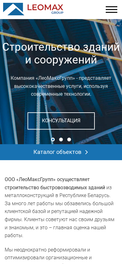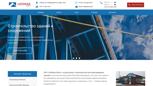 | AI-анализ | This online resource is a Belarusian company website specializing in the production and construction of buildings made of metal structures and sandwich panels. The company offers building and installation services for quick-erect structures and facilities. Optimal prices and quality guarantee are promised. The top keywords associated with this website include "leomax," "construction," "buildings," "panels," "montage," "installation," "design," and "reviews." The website provides information on their services, which include the installation of metal structures and sandwich panels, design of buildings, and various finishing works. The company also offers a contact section with multiple phone numbers and an email address for inquiries. The main services offered are the construction of various types of structures such as agricultural facilities, grain silos, potato silos, dairy farms, and various commercial buildings like stores, cafes, offices, and garages. The website also features |