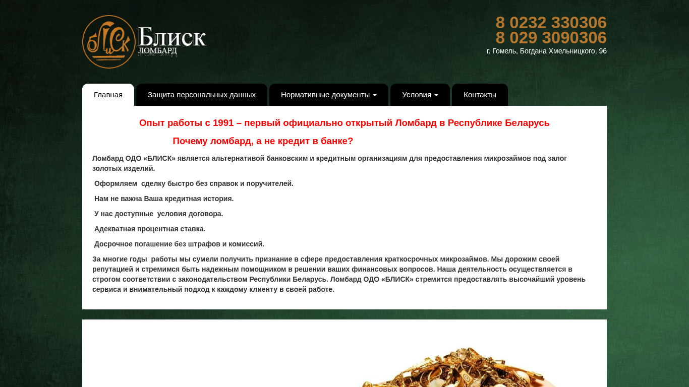 | AI-анализ | The web project "Lombard ODO 'Blisk' in Gomel" is a financial institution offering microloans secured by gold items. Contact details include phone numbers 8 0232 33-03-06 and 8 029 309-03-06. Operating hours are Monday to Friday from 9:00 to 20:00, with client services available until 19:30. Saturdays and Sundays are open from 9:00 to 15:00 for client services. The company is located in Gomel city, at Bogdan Hmelnickogo Street 96. The institution has been in operation since 1991 and provides an alternative to banking and credit institutions for short-term microloans. Clients do not need to provide credit history or guarante |