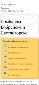 | AI-анализ | This online resource is the official website of OOO "RusSEL," a limited liability company based in Belarus. The company offers lombard services, allowing individuals to secure loans using various items as collateral. The accepted collateral includes household appliances, audio and video technology, telephones, notebooks, tablets, construction tools, and other miscellaneous items. The company prides itself on providing favorable offers in the market and offers loans without the need for guarantors, documentation, or credit history. The only requirements are a valid passport and the item being used as collateral. There are no hidden fees or commissions. The loan agreement is processed according to the current legislation, and the company assumes full responsibility for the safety of the borrower's property and provides insurance coverage. OOO "RusSEL" has branches in Bobruisk and Svetlogorsk. The Bob |