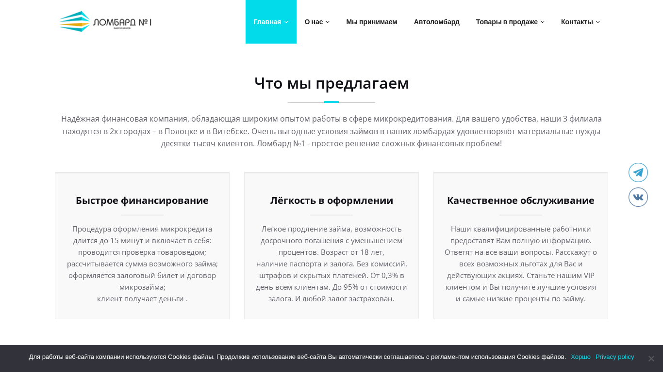 | AI-анализ | The website Lombard1 is a reliable financial company with extensive experience in the microcrediting sector. For your convenience, our 12 branches are located in three cities – in Polotsk, Novopolotsk, and Vitebsk. The company offers very attractive loan conditions to tens of thousands of clients. The procedure for obtaining a microcredit takes only 15 minutes and includes: inspection by a valuer, calculation of the possible loan amount, issuance of a pledge note and a microcredit agreement, and the client receives the money. The ease of application, quick loan extension, and the possibility of early repayment with reduced interest are advantages of the company. Clients must be at least 18 years old, have a passport, and provide collateral. There are no commissions, penalties, or hidden payments. Interest rates start from 0.3% per day for |