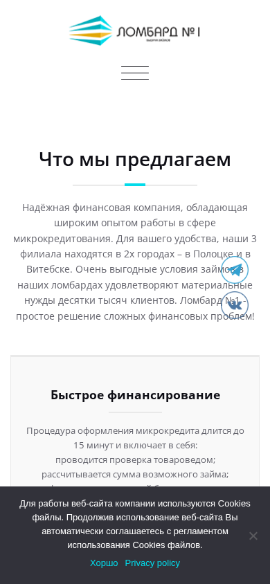 | Название / Заголовок | Lombard1 - Надёжная финансовая компания, обладающая широким опытом работы в сфере микрокредитования. Для вашего удобства, наши 12 филиалов находятся в 3 городах – в Полоцке, в Новополоцке и в Витебске. |