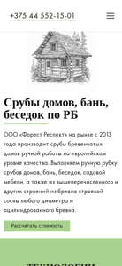 | AI-анализ | This website is a Belarusian company, 'Forest Respect', which has been producing handcrafted wooden structures since 2013. The company offers services related to the production of timber frame houses, saunas, gazebos, and other wooden structures using both round timber from European spruce and ocilinderned timber. The website provides information on the technology used, including manual log cabin cutting in Russian, Canadian, and Norwegian buckets, as well as foundation work, roofing, and pilings. The company also offers delivery and assembly throughout Belarus, and the option to use the client's own material or a combination of theirs and the company's. The website showcases completed projects and offers a contact number for inquiries. |