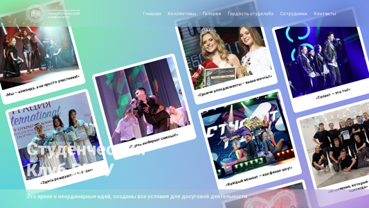 The website is for the Student Club of the Vitebsk State Technological University (VGTA) in Belarus. It is a place for students with shared interests to meet and engage in various creative, educational, and entertaining activities. The club is not a House or Palace of Culture, nor a philharmonic, but a creative family where everyone's opinion, contribution, and support matter. The club aims to discover and nurture the talents of all its members, providing opportunities for various forms of artistic expression. The website highlights the various activities offered, including theater, dance, and vocal performances, as well as the important roles of those behind the scenes, such as technicians and stagehands. The National Dance Ensemble "Vitebchanka" is featured, with Evgenia Akimova as its director. The club was established in 1966 and has a long history of nurturing
