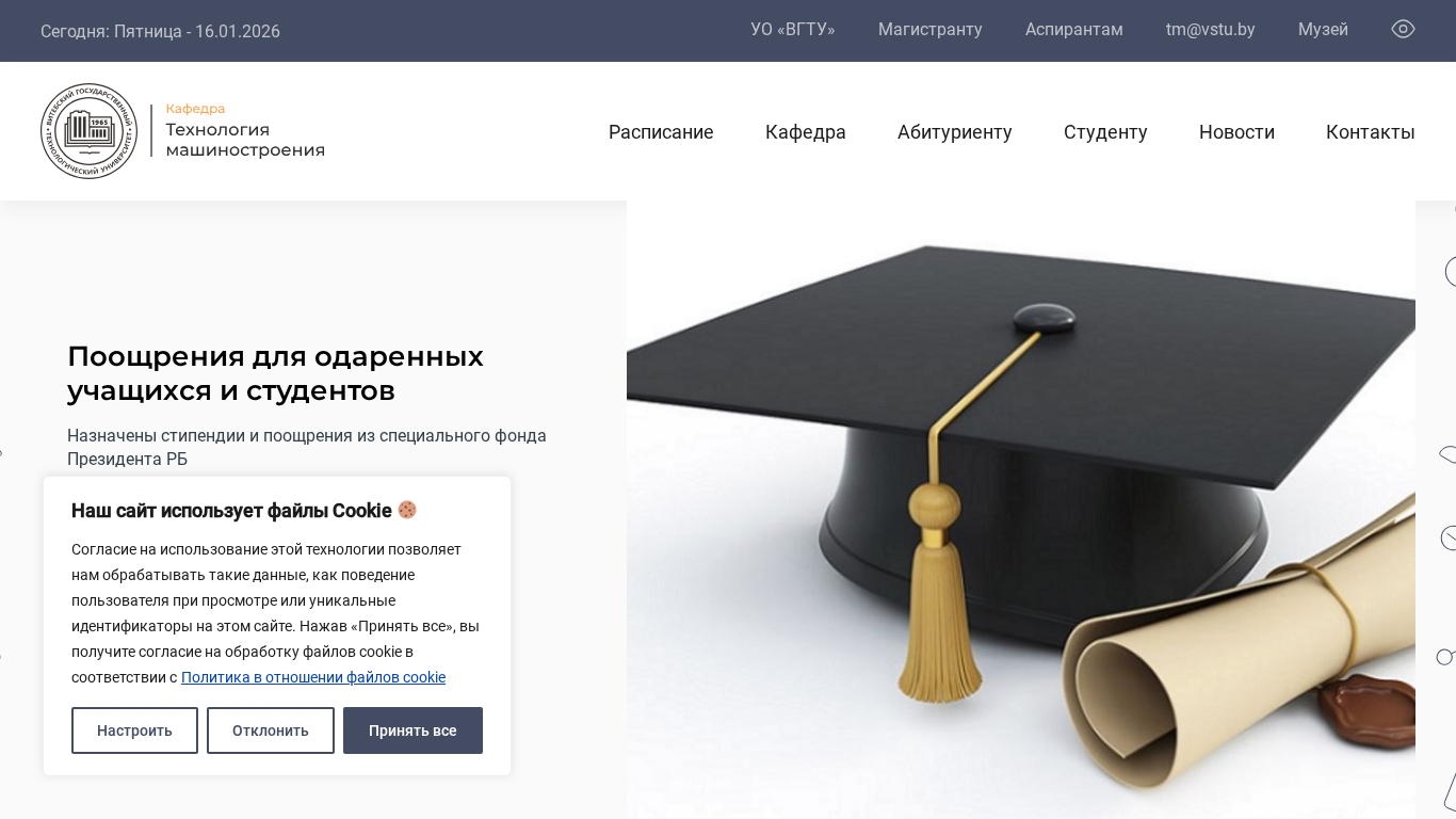 | AI-анализ | The web project "Кафедра «Технология машиностроения»" (tm.vstu.by) is a website for the Department of Technology Machinery at Vitebsk State Technical University (ВГТУ) in Belarus. The site uses cookies for user behavior tracking and site functionality, as stated in its cookie policy. The homepage includes sections for news, contacts, and a schedule, with links to the faculty, information for applicants and students, and services for laser cutting and engraving. Keywords associated with the site include 'vstu', 'вгту', 'Belarus', 'republic', 'Vitebsk', 'Moscow', 'technology', 'machinery', '2024-2026', and 'students'. There are no visible file cookies for display. The site's |
