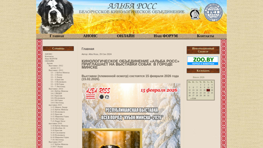| AI-анализ | --- The website "Albaross.by" is a platform dedicated to various dog shows and exhibitions in Belarus. With keywords related to "выставки" (exhibitions), "кубок" (cup), "минска" (Minsk), and various city names, it is clear that the main focus of the site is on organizing and promoting dog shows in different locations throughout the country. The site includes a forum for discussions and registration, as well as archives of past exhibitions dating back to 2012. The current exhibition schedule features events in Minsk, Volkovysk, Mariina Gorka, and Braslav, among others. The site also mentions a "Кинологічне Об'єднання «Альба Росс»" (Alba Ross Kennel Club), suggesting that the organization behind the site is involved in the |