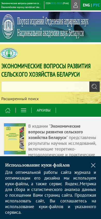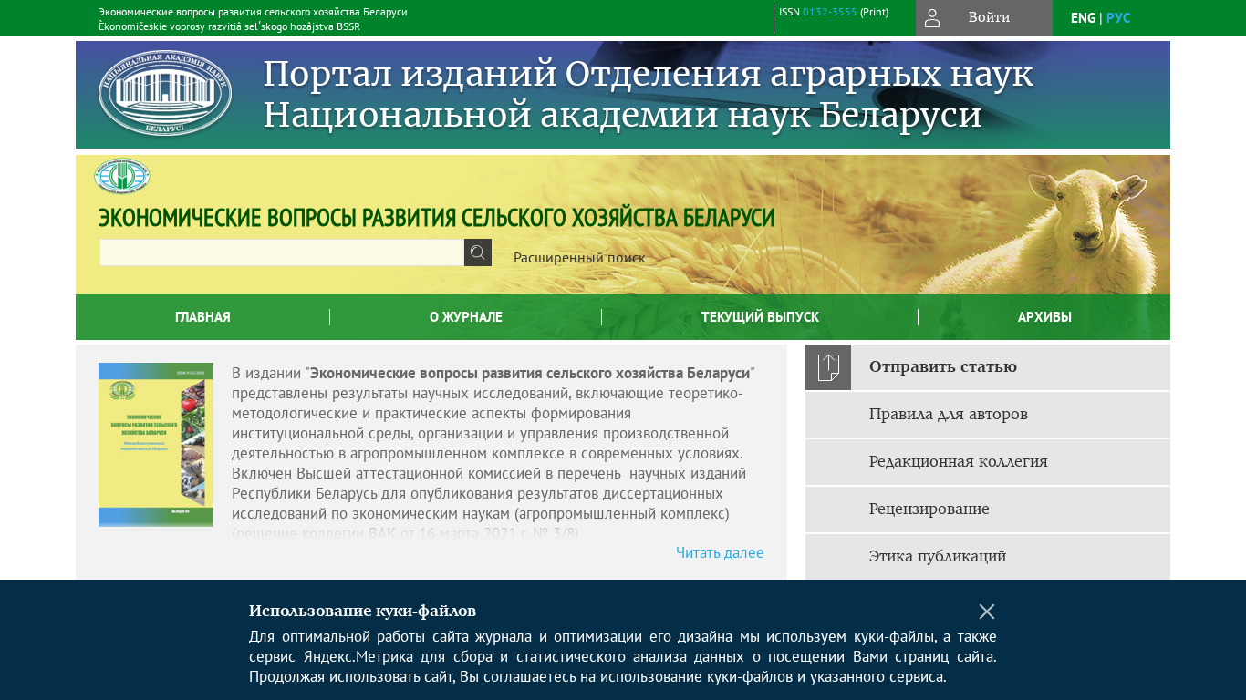--- The website is for the scientific, peer-reviewed journal "Экономические вопросы развития сельского хозяйства Беларуси" (Economic Questions of the Development of Agriculture in Belarus). It provides access to research articles on theoretical and practical aspects of institutional development, production organization and management in the agroindustrial complex under contemporary conditions. The journal is included in the list of scientific publications of the Republic of Belarus for publishing the results of doctoral dissertations in economics (agroindustrial complex) by the Higher Attestation Commission (decision of the commission No. 3/8 from March 16, 2021). The website offers current and archived issues, a search function, and an option to submit articles for publication. The research covers topics such as agricultural productivity, crop and livestock production, business planning, financing, government