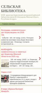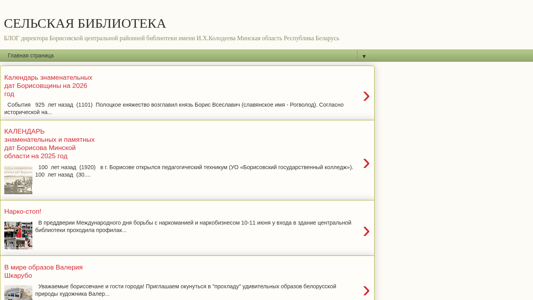 The website "СЕЛЬСКАЯ БИБЛИОТЕКА" is a blog by the director of the Borisov Central District Regional Library named after I.H. Kolodeev in the Minskaya oblast, Republic of Belarus. The blog covers the work of rural libraries in Belarus and abroad. Keywords associated with the website include 'библиотеки' (libraries), 'библиотека' and 'библиотек' (library), 'лет' (years), 'назад' (back), 'сельская' (rural), 'центральной' (central), 'главная' (main), 'страница' (page), 'сельских' (rural), 'визитки' (business cards), 'блога' (blog), 'нас' (us