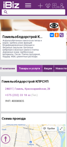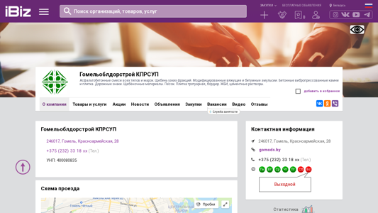 | Название / Заголовок | Гомельоблдорстрой КПРСУП - Асфальтобетонные смеси всех типов и марок. Щебень узких фракций. Модифицированные вяжущие и битумные эмульсии. Бетонные вибропрессованные камни и плитка. Дорожные знаки. Щебёночные материалы. Песок. Плитка тротуарная, бордюр. ЖБИ, цементные растворы.. 246017, Гомель, , Красноармейская, 28 |