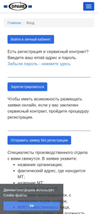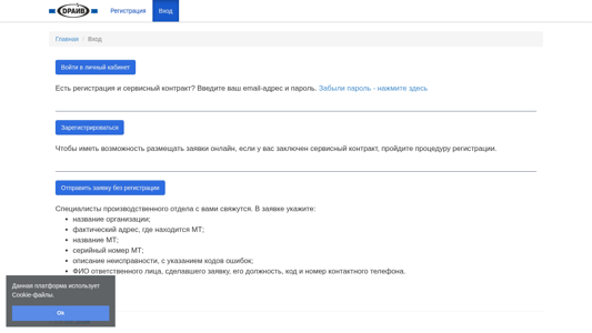 Сайт представляет собой личный кабинет для пользователей определенной производственной платформы. Он использует файлы Cookie для навигации. Интерфейс включает разделы для регистрации, входа, главной страницы и доступа к кабинету. Пользователям необходимо ввести свой электронный адрес и пароль для получения доступа. Если они забыли свой пароль, они могут нажать на ссылку для его восстановления. Платформа предлагает подачу онлайн-заявлений для тех, кто имеет контракт на услуги, и пользователи могут зарегистрироваться для этого варианта. Для подачи запроса без регистрации пользователям необходимо предоставить контактные данные для того, чтобы специалисты могли с ними связаться. Форма регистрации требует указания названия организации, ее фактического адреса, имени и серийного номера оборудования, описания неисправности с кодами ошибок, имени и должности лица, подавшего заявление, а также их контактного телефона.