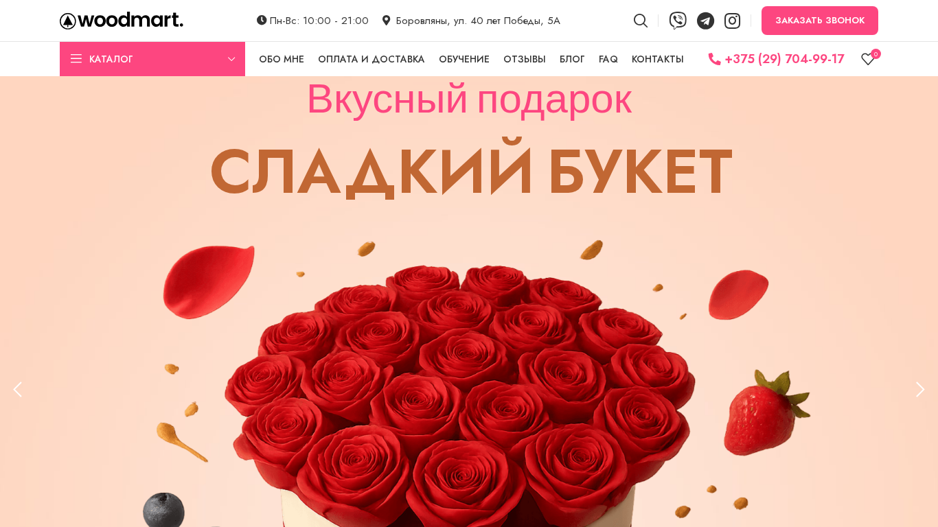 --- The web project "Niktitik.berserk-group.by" is an e-commerce platform selling sweet gifts, including chocolate bouquets and confectionery boxes. The site offers customization options such as adding names, messages, and thematic figures. It features a blog, FAQ, and contact information. The store is open from 10:00 to 21:00, located in Borovlyany, and offers delivery and payment services. The site contains over 345 handmade sweet creations, with 65+ unique flavors and customizable boxes. Over 850 satisfied customers have ordered from the site across Belarus. The site allows for quick viewing and adding items to a wishlist. Each product is carefully crafted with high-quality ingredients for an emotional gift experience.