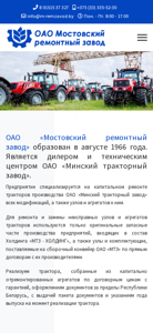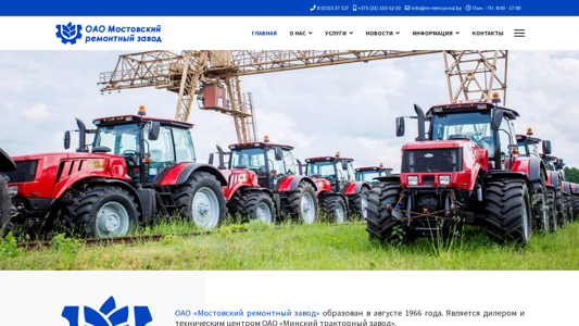 | AI-анализ | --- The web project "M-RemZavod.by" is the official website of OAO "Мостовский ремонтный завод" (Minsk Repair Factory), established in 1966 and serving as a dealer and technical center for OAO "Минский тракторный завод" (Minsk Tractor Factory). The site focuses on the repair and maintenance of Minsk-produced tractors and their components, using only original parts from affiliated companies. The business offers for sale reconditioned tractors, as well as rental of a storefront and service center. Information for shareholders is also available. |