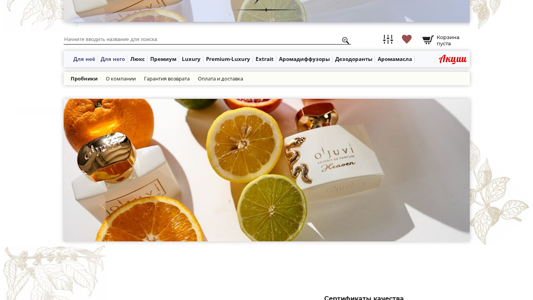<!--- End fragment ---> The web project Ojuvi.by is an online store for the perfume brand Ojuvi, offering natural fragrances as alternatives to well-known brands. The site doesn't function without JavaScript enabled. The perfumes are made from natural essences sourced in France and comply with IFRA standards. Ojuvi's products hold four certificates of quality: ISO 22716:2007 GMP, ISO 9001:2015, ISO 14001:2015, and OHSAS 18001:2007. Payment methods include cash on delivery, online payment, and through ERIP. Delivery is available across Belarus via Post or EMS. New arrivals include perfumes inspired by Rumeur LANVIN, B9 BOND NO: