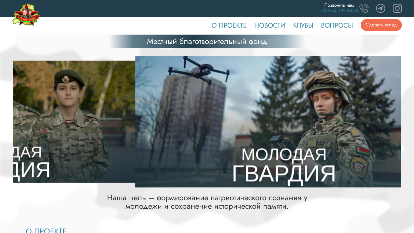 | AI-анализ | This website, titled "Молодая Гвардия" (Young Guard), is a local Belarusian charity organization focused on fostering patriotic consciousness among youth and preserving historical memory. The website mentions the support of the President of Belarus's decree #160 from May 2022, which aims to develop military-patriotic clubs. The Mолодая Гвардия Local Charitable Foundation was established on May 3, 2024, uniting all military-patriotic clubs formed within the inнутрен troops. The foundation has several key responsibilities: maintaining organizations that promote patriotic education for young people, preserving the memory of the Great Patriotic War and the historic legacy of the Belarusian people, and nurturing respect and love for the homeland. Currently, there are 23 military-patriotic clubs across |