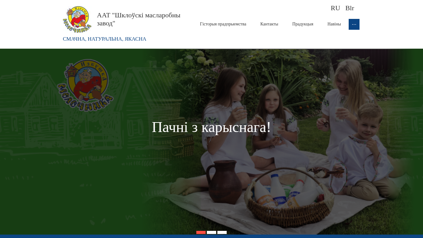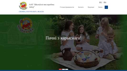 This online resource is dedicated to the production and sale of dairy products for household consumption by AAT "Shklovski Maslobny Zavod" in Belarus. The company is one of the oldest small-scale enterprises in the dairy industry of Magilevskaya oblast in the Republic of Belarus. It has a compact production capacity of 30 tons of natural dairy products per shift. The dairy products offered include milk, butter, cheese, yogurt, heated milk, porridge, cottage cheese. The primary keywords associated with this website are "milk," "butter," "cheese," "yogurt," "heated milk," "porridge," "cottage cheese." The top words related to this website include "shklov," "aktsyaneran," "maslobny," "zavod," "pradpryem