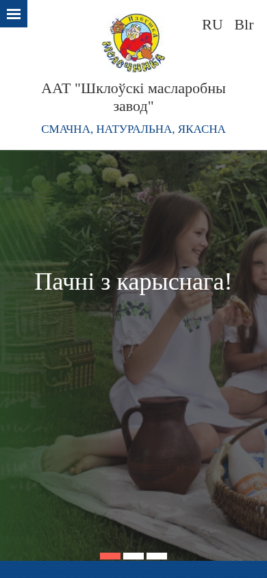 SEO-описаниеААТ "Шклоўскі масларобны завод" - адно са старэйшых малочных прадпрыемстваў малакаперапрацоўчай галіны Магілёўскай вобласці Рэспублікі Беларусь. Кампактнае прадпрыемства з праектнай магутнасцю выпуску 30 тон натуральнамалочнай прадукцыі за змену. Дзякуючы цудоўнай сыравіннай базе прадпрыемства выпускае прадукцыю выключных смакавых якасцей. Асноўная прадукцыя прадпрыемства - малако і малочная прадукцыя для штодзённага спажывання: малако, вяршкі, біяпрадукт кісламалочны "Бадзёрасць", ёгурты, малако топленае, ражанка, смятана, тварог.
