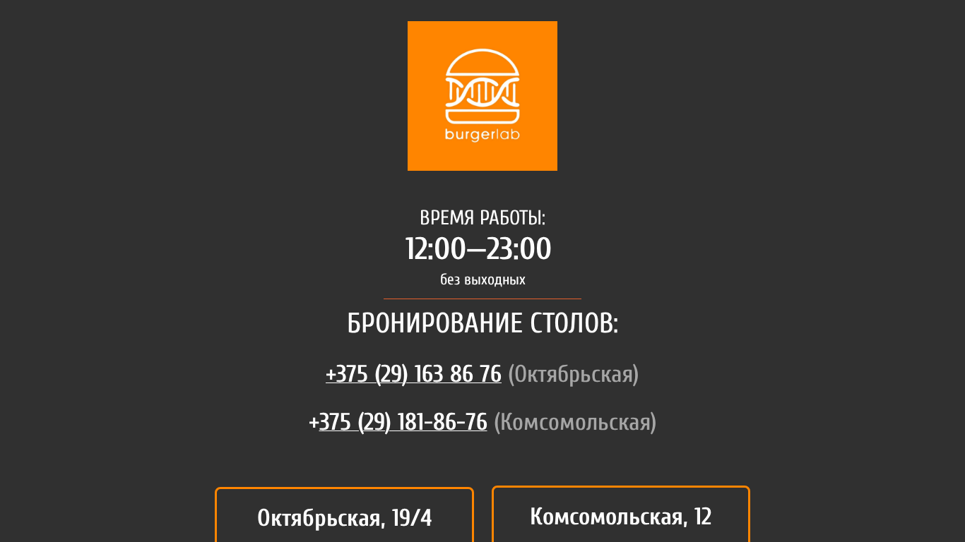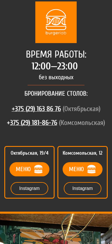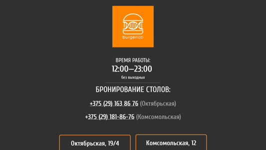 | AI-анализ | This website is for a restaurant named Burgerlab in Belarus, with two listed locations in October Square and Komsoomolskaya. The menu includes a variety of dishes, ranging from premium to traditional and everyday options. The restaurant offers sushi rolls, cold rolls, rice bowls, and other Japanese dishes. The contact information for reserving tables is provided, including phone numbers for both locations. The website also includes Instagram links for the menu and the restaurant. The operating hours are from 12:00 to 23:00, seven days a week, with no specified days off. |