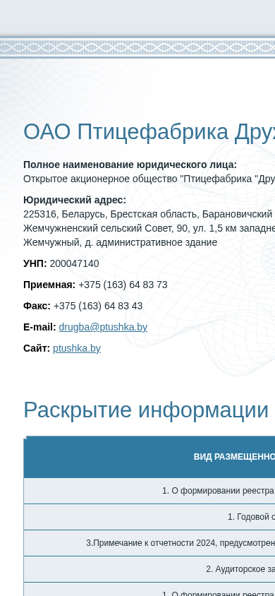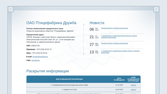 | AI-анализ | The portal Pticefabrika Druzhba OAO (Open Stock Company "Friendship Poultry Farm") is a Belarusian business website dedicated to providing information related to the company's general meetings for its shareholders. The site contains numerous announcements of past and upcoming general assemblies, along with their respective resolutions. The most recent announcement is for an extraordinary general meeting scheduled for March 27, 2025. Previous meetings include those held on October 21, 2025, February 13, 2025, November 21, 2024, and September 9, 2024, among others. The site also includes announcements for regular annual general meetings, such as the one scheduled for December 3, 2024. Users can access contact information for the company, including a phone number |