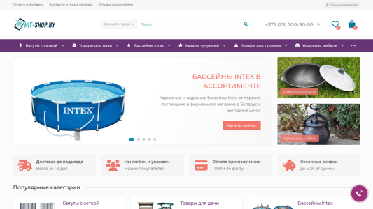 This online resource is Hit-shop.by, a website dedicated to tourism and active leisure products. It operates as an online store with low prices and up-to-date inventory. The website delivers items across Belarus without requiring prepayment. Key product categories include bathtubs with a mesh, garden items, inflatable pools from Intex, metal barrels, camping equipment, children's transportation, and children's toys. Other offerings include barbecue pits, stoves for cauldrons, and various accessories. The website provides contacts for customer support and offers a shopping cart and personal cabinet for user convenience.