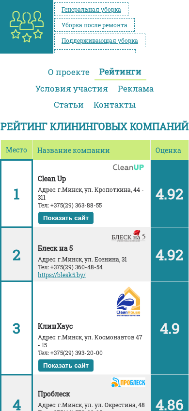 АдресКонтакты, РЕЙТИНГ КЛИНИНГОВЫХ КОМПАНИЙ, Место, Название компании, Оценка, 1, Clean Up, Адрес: г. Минск, ул. Кропоткина, 44