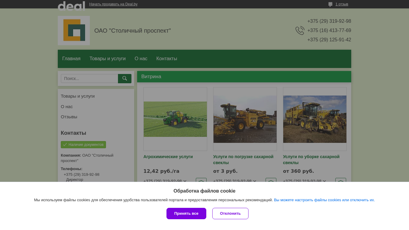 | AI-анализ | The website "ОАО "Столичный проспект"" is an e-commerce platform selling agricultural products and related services. The company offers various agrochemical services, such as sugar beet loading and harvesting, at competitive prices. The site provides contact information for the company, including multiple phone numbers for the director, accountant, chief engineer, and office. The main products listed include agricultural services, with prices for sugar beet loading and harvesting services provided. The site also offers polymeric bags for storing and transporting various types of agricultural produce, as well as a press-upacking machine for sale and rent. The site is operated by ОАО "Столичный проспект" and is accessible via the .BY domain deal.by. |