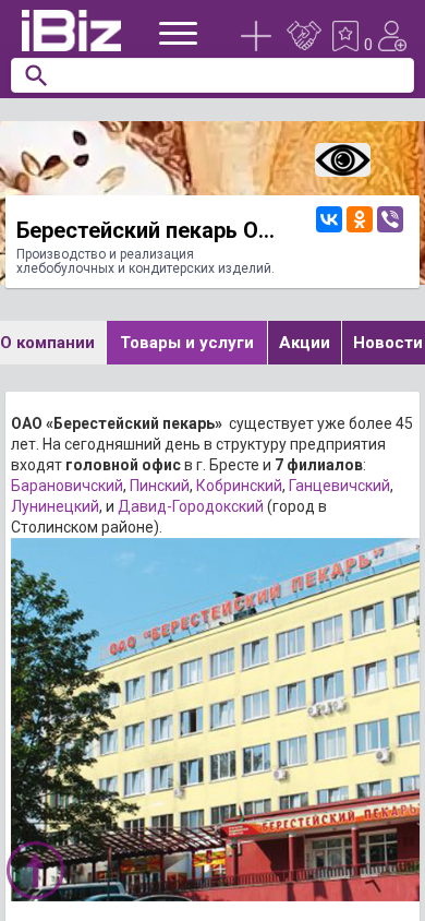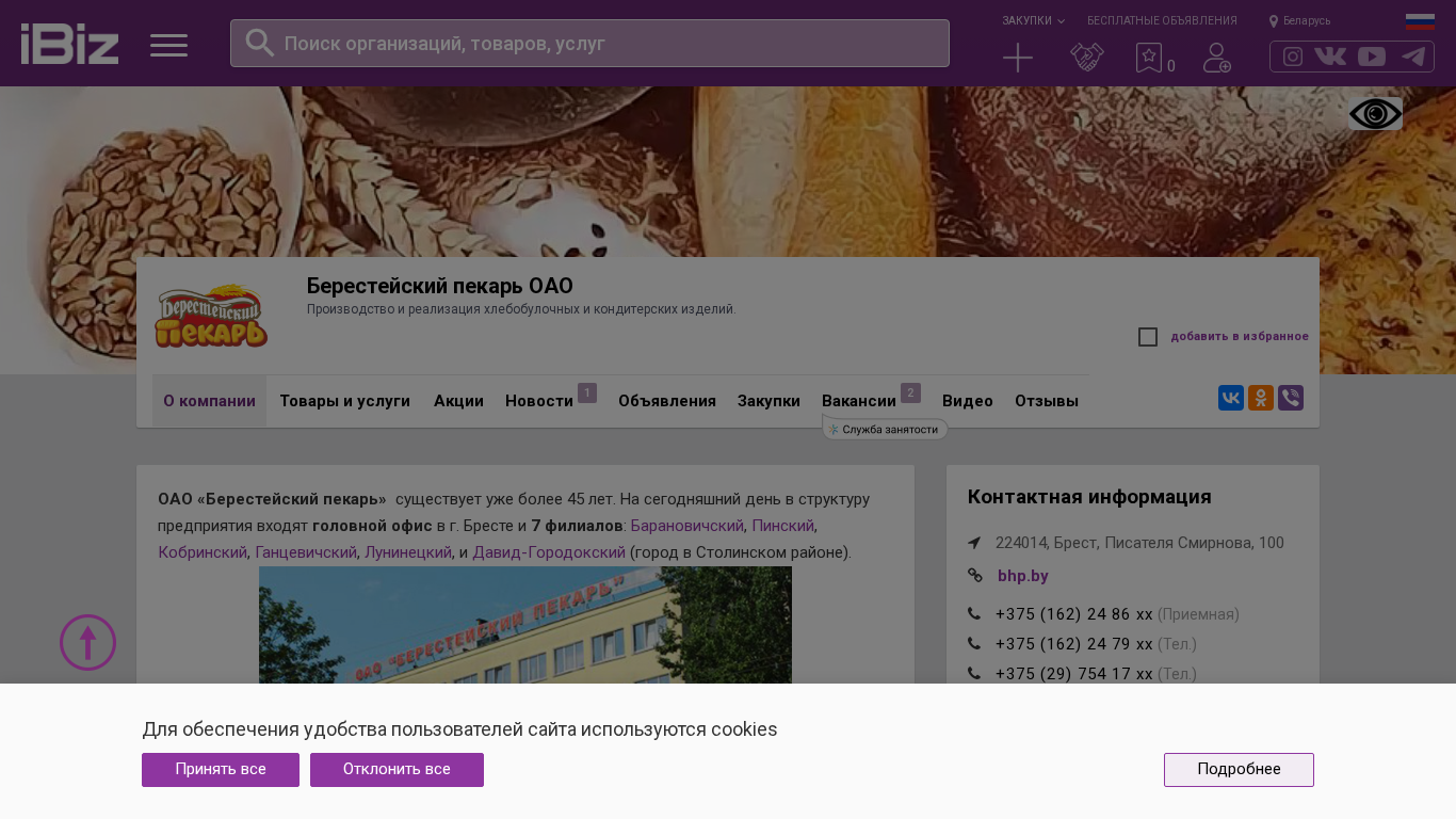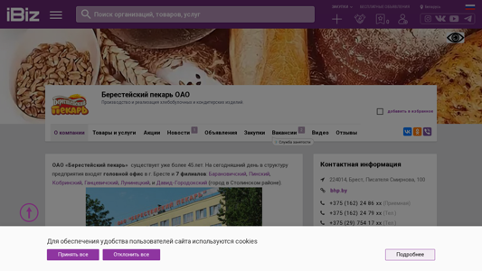 | AI-анализ | This online resource belongs to Берестейский пекарь ОАО, a company based in Брест, Belarus, at Писателя Смирнова 100. The website focuses on the production and sale of hlebo-bulochnym and kondi-terskym izdeliyam, or baked goods and pastries. The company has existed for over 45 years and operates a headquarters in Брест and seven branches in Барановичы, Пинск, Кобринь, Ганцевичи, Лунинец, and Давид-Гorodok. Берестейский пекарь ОАО offers a wide range of products, including conditer-skie izdeliya, or confectionery, khleb, or bread, sukharno-baranochnye izdeliya, |