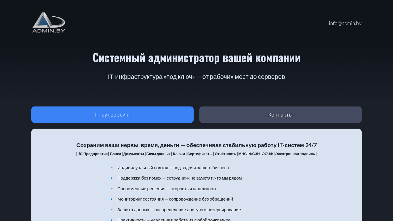 Ключевые словаadmin.by компьютеры сервера ноутбуки обслуживание it-аутсорсинг ремонт сборка модернизация ПК установка Windows Linux драйвера программы софт настройка Интренет сети роутера wi-fi восстановление информации компьютеров ноутбуков компьютерная помощь услуги сервис выезд офис Минск