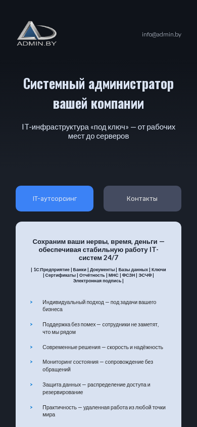 The web project "admin.by - ITO - Minsk" is a private IT company based in Minsk, Belarus. The company offers IT infrastructure solutions 'under key' from workstations to servers, providing IT outsourcing services. The website emphasizes the importance of maintaining stable IT systems 24/7, with a focus on clients in the banking sector and document management. Services include IT support, modern solutions, data protection, and remote work capabilities. The company can be contacted at [29] 6666-586 or via email at info@admin.by. The company registration number is UNP-191799469, with OKPO 380876015000. Banking details are provided with the UNP number 807000069 and OKPO 3758