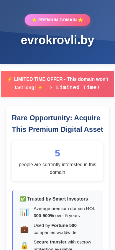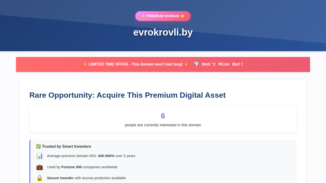 | AI-анализ | language: by This online resource is an e-commerce platform selling premium domains, specifically the domain evrokrovli.by. The website offers potential buyers a rare opportunity to acquire this premium digital asset with a limited time offer, emphasizing its scarcity and value. The domain is described as a six-letter asset and is currently of interest to six individuals. The website promises secure transfer with escrow protection and a money-back guarantee, and highlights the potential investment's ROI of 300-500% over five years and usage by Fortune 500 companies. The language of the website is Belarusian (.by). |