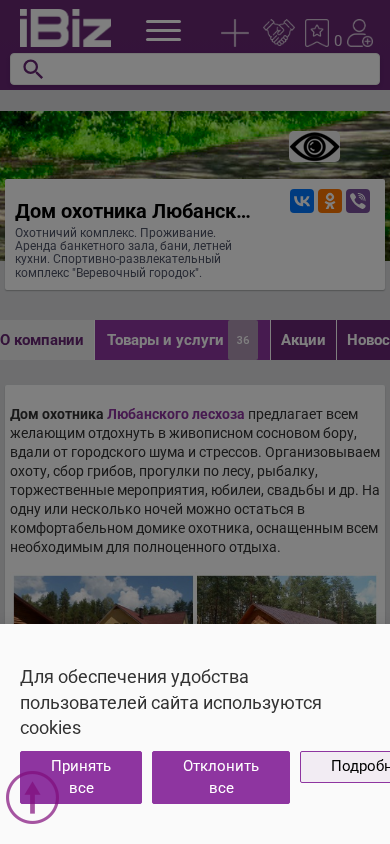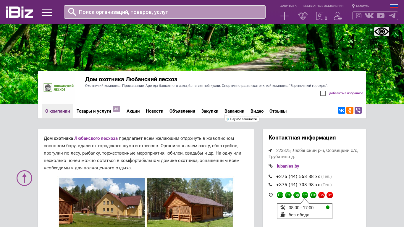 | Название / Заголовок | Дом охотника Любанский лесхоз - Охотничий комплекс. Проживание. Аренда банкетного зала, бани, летней кухни. Спортивно-развлекательный комплекс "Веревочный городок".. 223825, , Осовецкий с/с, Трубятино д. |
