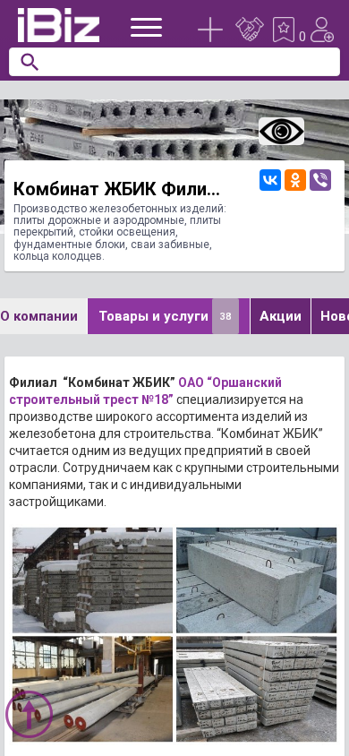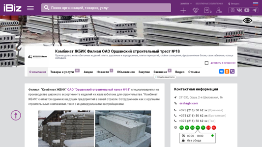 | Название / Заголовок | Комбинат ЖБИК Филиал ОАО Оршанский строительный трест №18 - Производство железобетонных изделий: плиты дорожные и аэродромные, плиты перекрытий, стойки освещения, фундаментные блоки, сваи забивные, кольца колодцев.. 211030, Орша, , 2-я Шкловская, 16 |