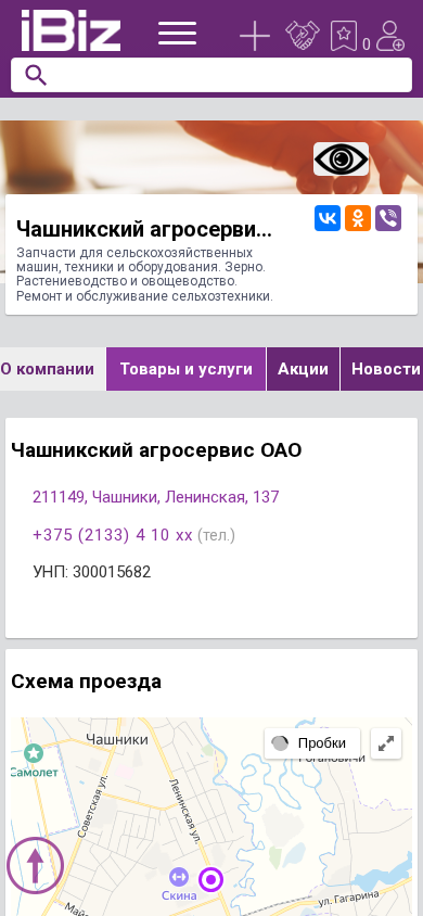 This website is the official online presence for "Чашникский агросервис ОАО," a company based in Чашники, Belarus. The company specializes in providing parts, equipment, and services for agricultural machinery, grain production, plant cultivation, and vegetable farming. They also offer repairs and maintenance for agricultural equipment. The address of the company is Ленинская 137, 211149, Чашники. The phone number for the company is +375 (2133) 4 10 xx. The company is registered with the Belarusian Unified State Register of Legal Entities under the number 300015682. The website includes a map for directions, business hours, and contact information. It appears to be part of a larger directory or catalog of businesses in Belarus.