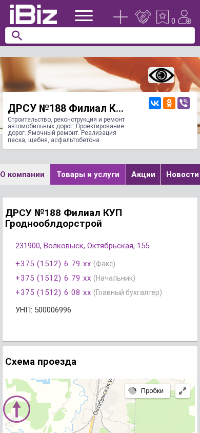 The website is dedicated to DRSU №188 Filial KUP Grodnooblestroi, a subsidiary company that specializes in the construction, reconstruction, and maintenance of automobile roads. The website provides information on the company's services, which include road design, jammable repair, and the sale of sand, gravel, and asphalt concrete. The contact information, including phone numbers and an address in Voлковыsk, is also available on the website. The company is in the category of road-building and construction technology in Volkovysk.