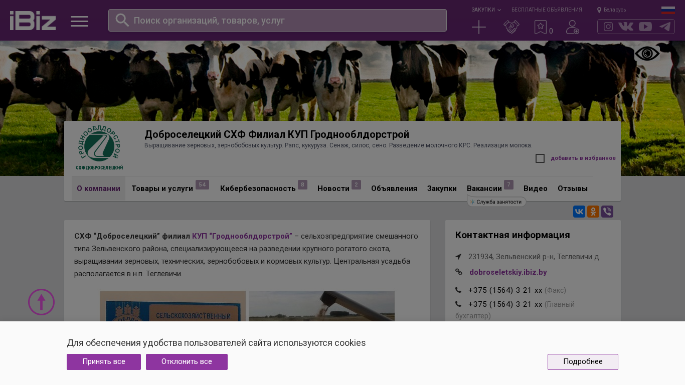 | Название / Заголовок | Доброселецкий СХФ Филиал КУП Гроднооблдорстрой - Выращивание зерновых, зернобобовых культур. Рапс, кукуруза. Сенаж, силос, сено. Разведение молочного КРС. Реализация молока. . 231934, , Теглевичи д. |