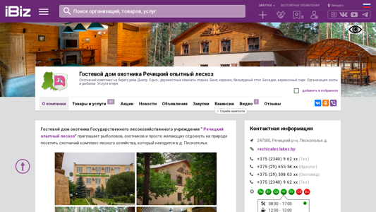 | SEO-описание | Гостевой дом охотника Речицкий опытный лесхоз - Охотничий комплекс на берегу реки Днепр. Одно-, двухместные комнаты отдыха. Баня, караоке, бильярдный стол. Беседки, веревочный парк. Организация охоты и рыбалки. Услуги егеря.. Схема проезда, контактные телефоны, адрес компании Гостевой дом охотника Речицкий опытный лесхоз. 247500, , Пескополье д. |