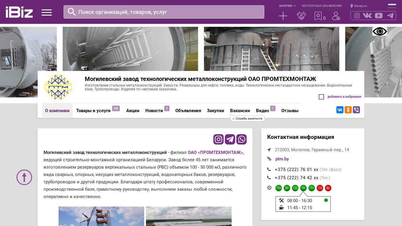 Название / ЗаголовокМогилевский завод технологических металлоконструкций ОАО ПРОМТЕХМОНТАЖ - Изготовление стальных металлоконструкций. Емкости. Резервуары для нефти, топлива, воды. Технологическое нестандартное оборудование. Водонапорные баки. Трубопроводы. Изделия по чертежам заказчика.. 212003, Могилев, , Гаражный пер., 14