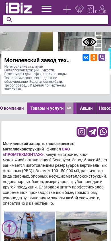 The website is for Могилевский завод технологических металлоконструкций ОАО ПРОМТЕХМОНТАЖ, a manufacturing company based in Могилев, Belarus. The company specializes in the production of various types of metal constructions, including tanks with a capacity of 100 to 50,000 m3, and non-standard technological equipment such as water towers, tanks for oil, fuel, and water, as well as tubing and products based on customer drawings. The company's team of professionals, modern production base, and skilled management enable them to efficiently and effectively produce complex orders. The website provides information on the company's products, including vertical steel tanks, construction structures, technological structures, metal structures, non-standard technological equipment, water tanks, piping, and custom-made items. In 200