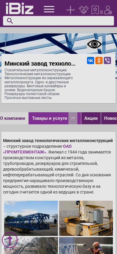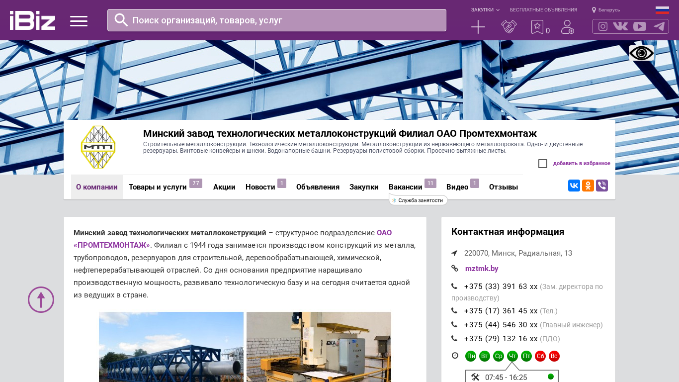 Название / ЗаголовокМинский завод технологических металлоконструкций Филиал ОАО Промтехмонтаж - Строительные металлоконструкции. Технологические металлоконструкции. Металлоконструкции из нержавеющего металлопроката. Одно- и двустенные резервуары. Винтовые конвейеры и шнеки. Водонапорные башни. Резервуары полистовой сборки. Просечно-вытяжные листы.. 220070, Минск, , Радиальная, 13