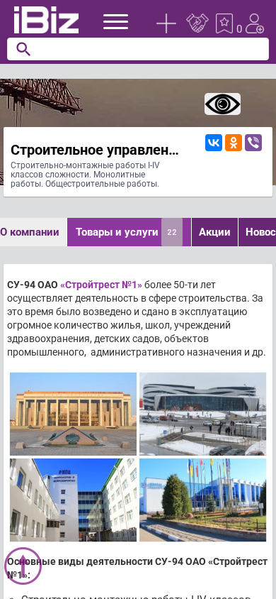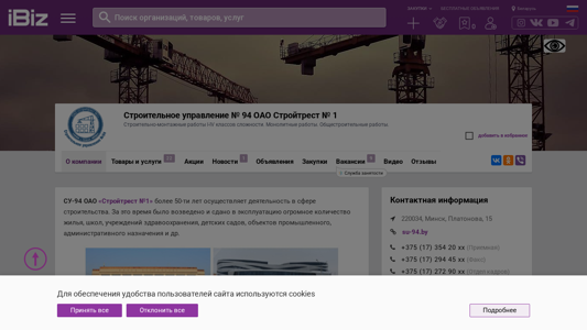 | AI-анализ | The portal is a construction company website named Строительное управление № 94 ОАО Стройтрест № 1, located in Минск, Belarus, at Платонова 15. The company specializes in construction and mounting works of I-IV complexity levels, monolithic works, and general construction works. The website provides information about the company's services, projects, and contact details, including phone numbers and an address. Some of the company's completed projects include the Olympic preparation center for artistic gymnastics, a ski resort, a hockey club, a neuroscience and neurosurgery center, and the Minsk City Hall, among others. The website also offers rental services for construction equipment and the sale of related products, such as universal formwork for ceilings, monolithic formwork, modular support structures, and steel closed profiles. |