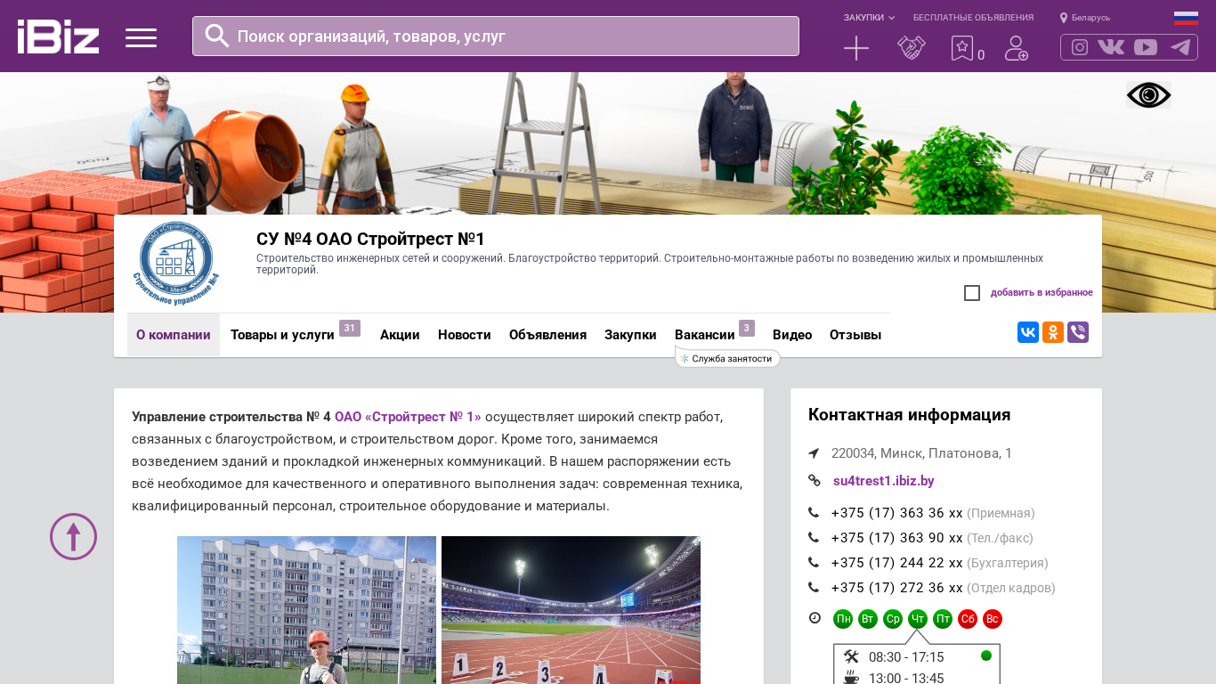 favicon СУ №4 ОАО Стройтрест №1 - Строительство инженерных сетей и сооружений. Благоустройство территорий. Строительно-монтажные работы по возведению жилых и промышленных территорий. . 220034, Минск, , Платонова, 1