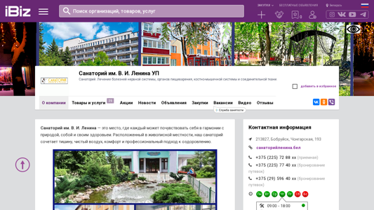 | AI-анализ | <aside> 🔗 [sanlen.ibiz.by](http://sanlen.ibiz.by/) </aside> This website is for a sanatorium named after V. I. Lenin UP, located in Bobruysk, Belarus, at Chonгарskaya 193. The sanatorium specializes in the treatment of nervous system diseases, disorders of the digestive system, musculoskeletal system, and connective tissue. The website includes information about the location, contact details, and company name. The site also features sections for company information, goods and services, announcements, vacancies, and user reviews. The main focus of the sanatorium is to provide a harmonious environment for rest and healing, combining natural surroundings, comfort, and professional healthcare approaches. The sanatorium accepts guests of all ages and has a reputation as a |