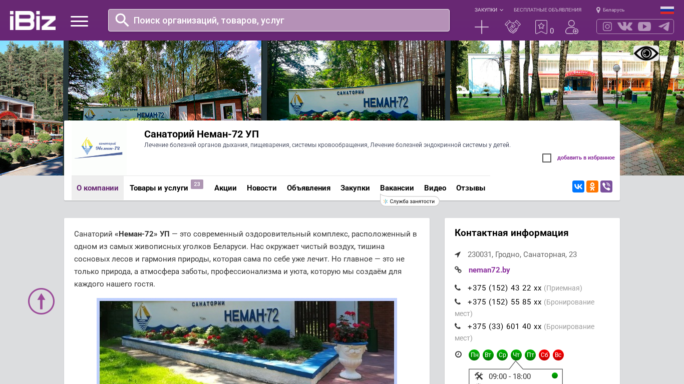 <!DOCTYPE html> <html lang="ru"> <head> <meta charset="UTF-8"> <meta name="description" content="Санаторий Неман-72 УП - Лечение болезней органов дыхания, пищеварения, системы кровообращения, Лечение болезней эндокринной системы у детей.. 230031, Гродно, Санаторная, 23"> <meta name="viewport" content="width=device-width, initial-scale=1.0"> <meta name="keywords" content="услуги, неман-72, без, санаторий, лечение, закупки, объявления, отдыха, обеда, тэл,