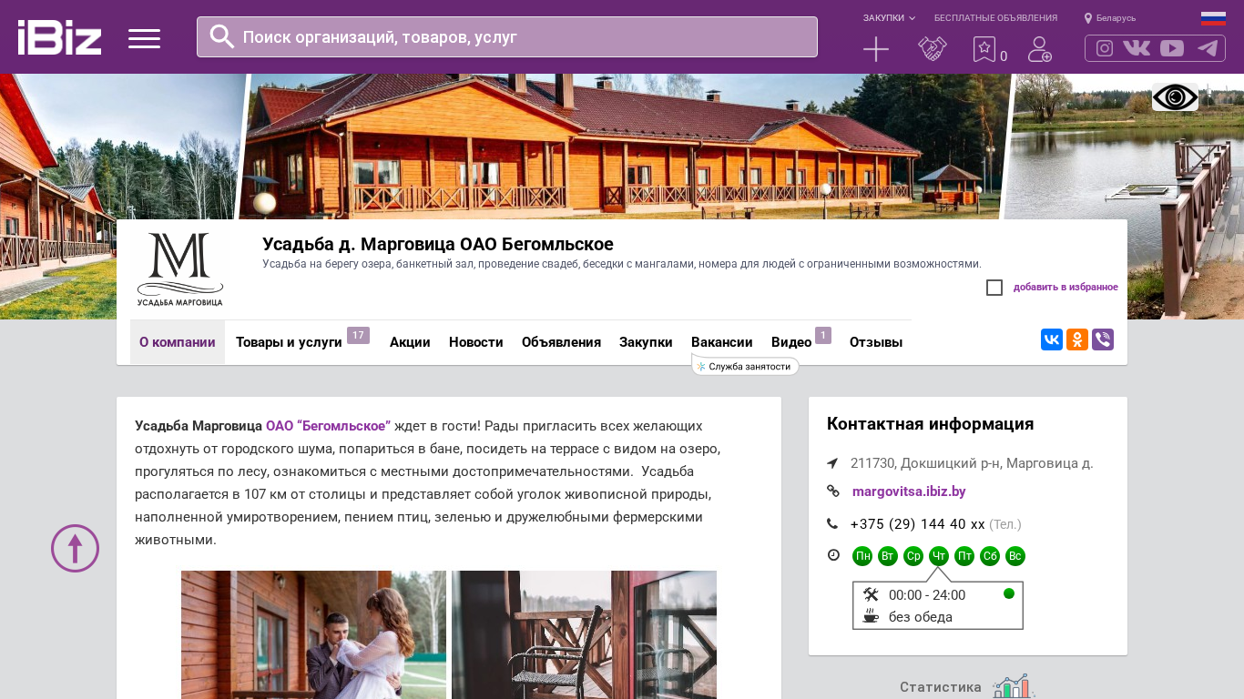 | Название / Заголовок | Усадьба д. Марговица ОАО Бегомльское - Усадьба на берегу озера, банкетный зал, проведение свадеб, беседки с мангалами, номера для людей с ограниченными возможностями.. 211730, , Марговица д. |