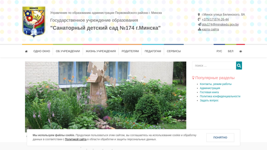 | AI-анализ | This online resource is a website for the Sanatornyy Detskiy Sad No. 174 educational institution located in Minsk, Belarus. The title of the website is "Детский сад" (Children's Garden) and the description includes information about the administration, schedule, admission procedures, electronic services, and policies related to personal data and disability support. Keywords associated with the website include "сайта" (site), "советы" (counsel), "подробнее" (in detail), "работы" (works), "режим" (schedule), "образования" (education), "приема" (admission), "услуги" (services), "карта" (map), "график" (schedule), "граждан" (citizens), "объединения" (associations), "роди |
