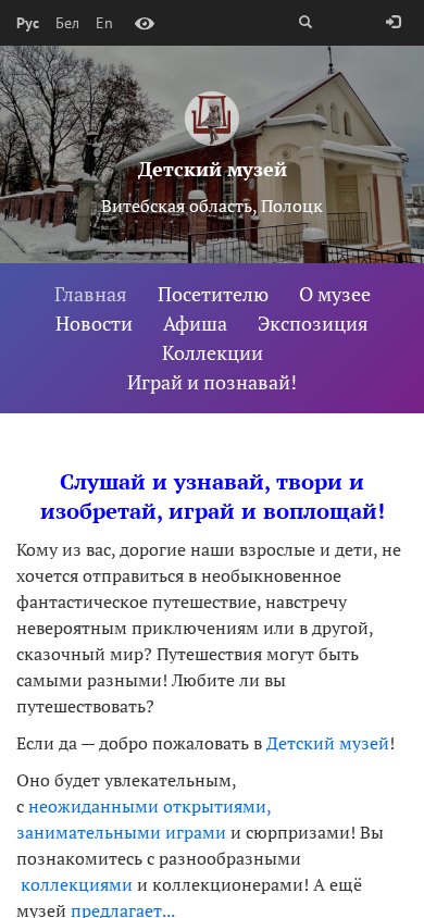 | AI-анализ | language: ru The website is a digital platform for the Children's Museum in the city of Polotsk, Belarus. It provides news and event schedules, visitor information, pricing, exhibition details, collections, and resources for museum educators. |