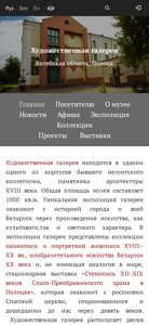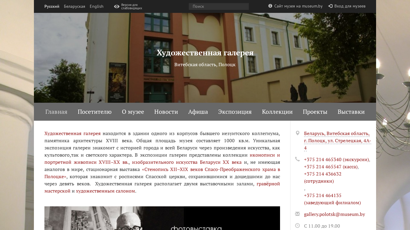 | AI-анализ | This website is an art gallery with news and event information, visitor information, prices, exhibitions, collections, and materials for museum professionals. The title is "Художественная галерея" (Art Gallery) and it includes a description for a museum in the city of Polotsk, Belarus, in the Russian, Belarusian, and English languages. The website has a unique exhibition showcasing the history of the city and Belarus through art, including collections of icon painting and portrait painting from the 18th to 20th centuries, and a permanent exhibition of the wall paintings from the Sпасо-Преображенского храма in Polotsk, which dates back to the 12th-19th centuries. The gallery has two exhibition halls, a gravure workshop, and an art salon. The website provides information on upcoming exhibitions, such |