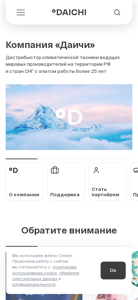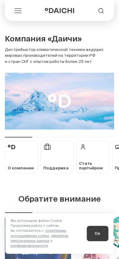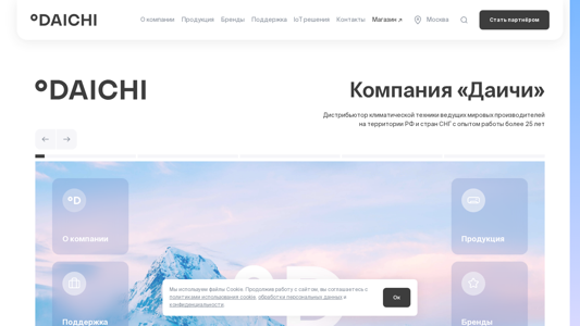 The web project "Official site of Daichi Company" is a distributor of climate technology for the Russian Federation and the CIS countries with over 25 years of experience. The site provides information on the company, its products, brands, and offers support for IoT climate solutions. Visitors can find contacts and a shop in Moscow, as well as the opportunity to become a partner. The main product categories include residential air conditioning, multi-zone and industrial systems, heating systems, and IoT climate solutions. The site also features news, customer service, and a variety of promotions and loyalty programs. The domain is daichi-belarus.by.
