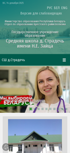 | AI-анализ | This website is the homepage of Middle School No. 1 in the village of Stradech' named after N.E. Zaytsa, located in the Brest Region of Belarus. The website provides information on the admission process, schedules, contacts, and administrative procedures for the school. It also includes sections on the educational process, safety measures, and various services offered by the school. The website is operated by the Ministry of Education of the Republic of Belarus, and contains links to the Brest Regional Executive Committee and the Brest Oblast Executive Committee. The school year for 2025/2026 is featured prominently, with information on the academic calendar, enrollment process, and contact information for various departments. Additionally, the website includes sections on the history and traditions of the school, as well as various educational resources and initiatives. The website is available in Russian, Belar |