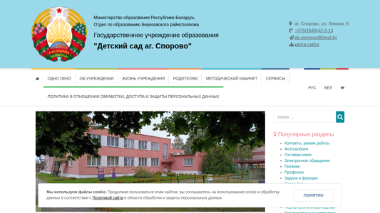 --- The website is for the state educational institution "Children's kindergarten of the agricultural cooperative Sporovo" located in Brest, Belarus. The kindergarten is under the Ministry of Education of the Republic of Belarus and is managed by the Berezovsky district executive committee's education department. The website provides information on the kindergarten's location, schedule for accepting citizens, administrative procedures, contact details, and tasks and functions of the administration. It also includes sections for the pedagogical staff, licensing information, and important documents such as policies on confidentiality and state symbols. The website offers electronic application forms and popular inquiries, as well as links to higher authorities and trust services. It features sections on the institution's history, groups, photo gallery, and various services, and includes an archive of news and announcements, as well as a guestbook and results of surveys